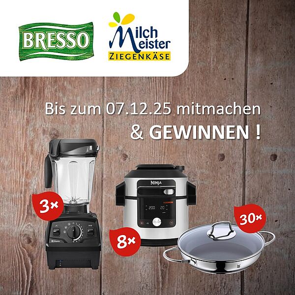 Vom 01.09. - 07.12.25 mit unseren Aktionsprodukten BRESSO Frischkäse Kräuter und MILCHMEISTER Ziegenfrischkäse tolle Gewinne sichern!